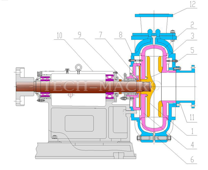 1 Impeller 2 Volute Casing 3 Throat Bush 4 Back Liner 5 Cover Plate 6 Frame Plate 7 Packing Box 8 Expeller 9 Shaft Sleeve 10 Frame 11 Suction Tube 12 Discharge Tube |