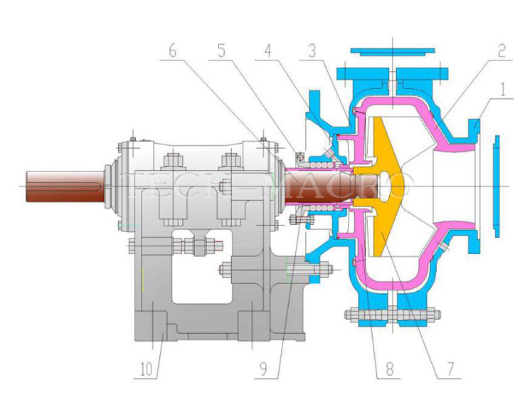 ●Заменяемый главные изнашиваемые части шламвых насосы,то есть то есть проточные части изготавливаются из развидых износостойких металлических материалов,например А05,А49,и другие высокохромистый сплав или корроизонностойкого натурального эластомера.